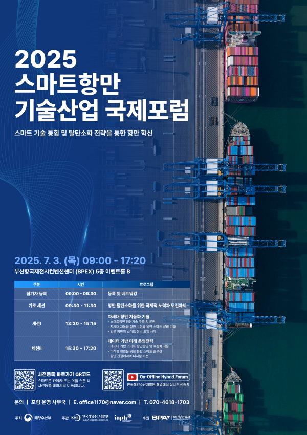 [충청뉴스큐] 해양수산부는 한국해양수산개발원, 국제항만협회와 함께 7월 3일 부산항국제전시컨벤션센터에서 ‘스마트항만 기술산업 국제포럼’을 개최한다고 밝혔다.