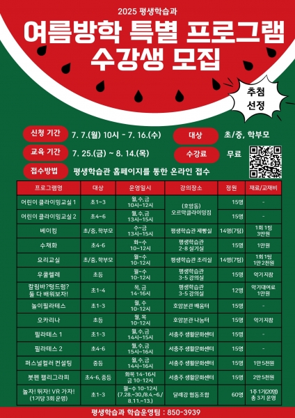 프로그램 신청은 평생학습관 누리집을 통한 온라인 접수로 7월 7일 오전 10시부터 16일까지 진행되며 자녀 1인당 최대 3강좌까지 신청할 수 있다.