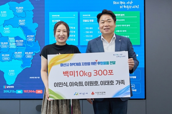 [충청뉴스큐] 아산시는 2일 이숙희 씨 가족이 취약계층을 위해 백미 10kg 300포를 전달했다고 밝혔다.