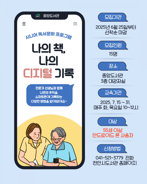 [충청뉴스큐] 천안중앙도서관은 오는 7월 15일~ 31일 시니어 독서문화 프로그램 ‘나의 책, 나의 디지털 기록’을 운영한다고 4일 밝혔다.