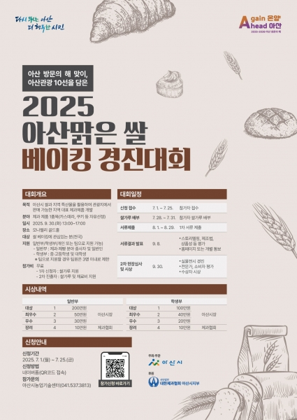 [충청뉴스큐] 아산시는 ‘아산 방문의 해’를 맞아 ‘아산관광 10선’과 연계해 지역 농산물 소비 촉진과 관광 활성화를 도모하기 위한 ‘2025년 아산맑은 쌀 베이킹 경진대회’ 참가자를 25일까지 모집한다.