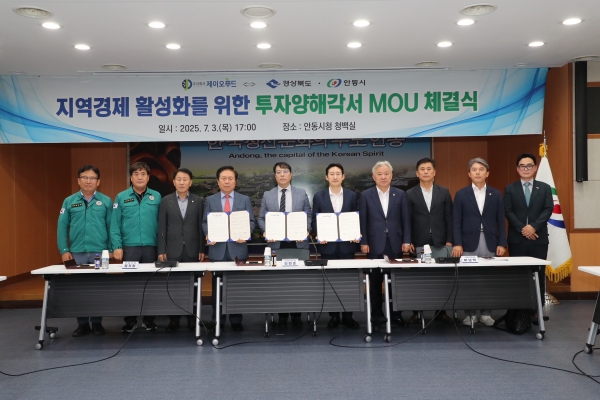 [충청뉴스큐] 경상북도와 안동시는 3일 안동시청 청백실에서 ㈜제이오푸드와 총 87억원 규모의 식육·식품 제조공장 신설을 위한 투자 양해각서를 체결했다.