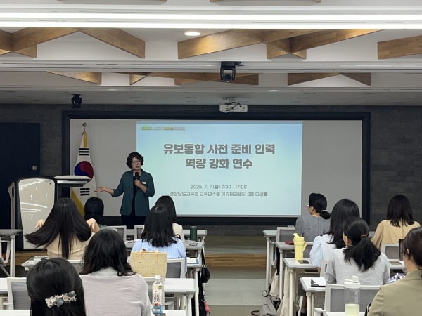 [충청뉴스큐] 경상남도교육청은 7일 교육연수원 에듀테크센터에서 유보통합사전 준비 인력을 대상으로 ‘유보통합 정책 이해 제고 및 역량강화’ 연수를 열었다.