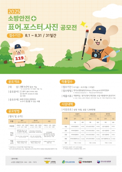 공모작은 8월 1일부터 31일까지 한국소방방송 누리집을 통해 온라인으로 접수하며 심사는 전문가 평가와 온라인 공개 검증을 병행해 공정성과 국민 참여를 함께 보장한다.