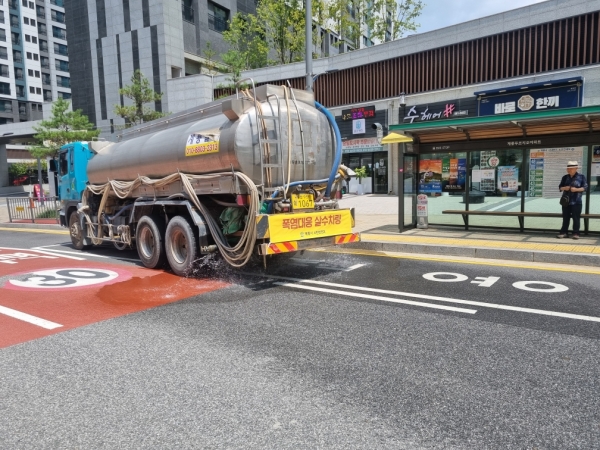 또한, 도로 살수차를 활용한 도로 살수 작업도 지속적으로 실시해 도심 열섬현상 완화와 체감온도 저감에 기여할 계획이다폭염으로 인한 건강 피해 예방을 위해 쿨링세트 800개와 부채 1,000개를 제작·배부하는 등 폭염 예방 수칙 홍보에도 적극 나서고 있다.