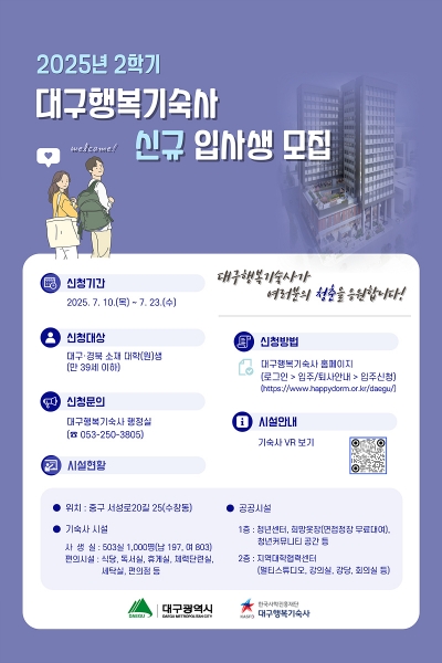 [충청뉴스큐] 대구광역시는 한국사학진흥재단 대구행복기숙사에 입주할 2학기 입사생을 7월 10일부터 23일까지 모집한다.