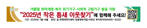 한편 ‘작은 틈새 이웃찾기’ 사업 참여는 각 읍·면 행정복지센터 맞춤형복지팀 또는 서천군 복지핫라인, ‘복지위기 알림앱’을 통해 신청할 수 있다.