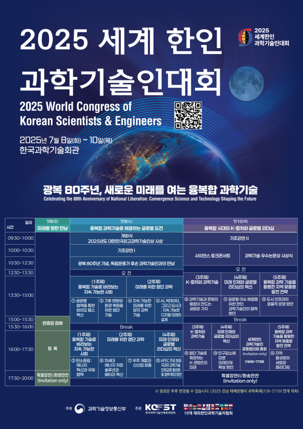 특히 이번 대회는 광복 80주년을 맞아, 세계 각지에서 과학·기술로 대한민국의 발전을 뒷받침해 온 한인 과학기술인들의 헌신과 노고를 되새기고 이를 계승해 글로벌 기술패권 경쟁 속에서 국가 과학기술 주권 확보와 미래 도약의 발판을 마련하는 뜻깊은 계기가 될 것으로 기대된다.