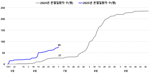 응급실을 보유한 서울 소재 모든 병원이 참여하는 ‘온열질환 응급실 감시체계’ 운영 결과, 2025년 5월15일부터 7월7일까지 발생한 온열질환자는 총 85명으로 전년 대비 58명이 증가했다.