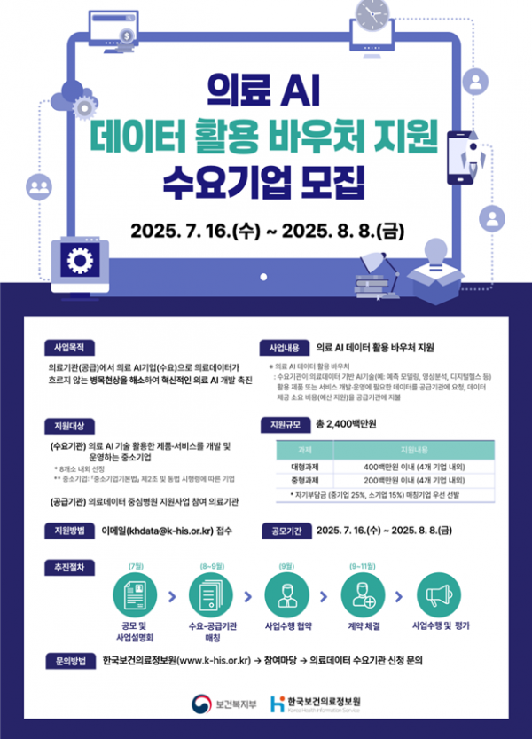 [충청뉴스큐] 보건복지부와 한국보건의료정보원은 안전한 의료데이터 활용 촉진을 위해 7월 16일부터 8월 8일까지 ‘의료 AI 데이터 활용 바우처 지원사업’ 수요기업을 공모한다고 밝혔다.