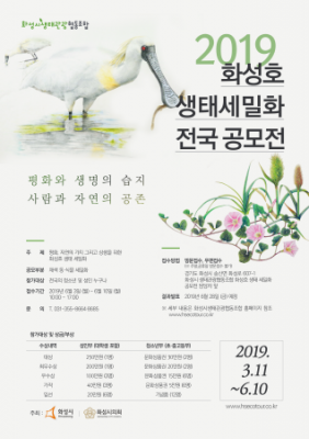 [충청뉴스큐] 화성시는 화성호와 주변 습지의 생태적 가치를 알리기 위해 ‘2019 화성호 생태 세밀화 전국 공모전’을 개최한다. 지난 3월부터 공고된 이번 공모전은 전국의 청소년 및 성인이라면 누구나 응모할 수 있으며, 참가를 희망하는 지원자는 오는 6월 3일부터 10일까지 방문 및 우편을 통해 작품 접수가 가능하다. 작화는 반드시 화성호 자생 생물을 대상으로 한다.