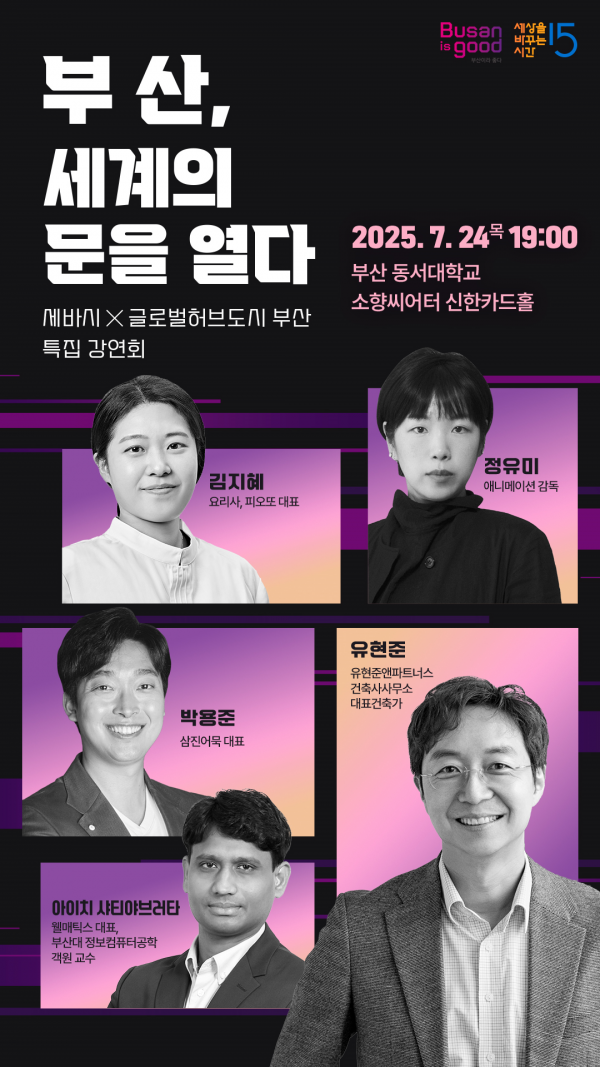 이날 5명의 연사들은 다양한 분야에서 '부산의 가능성'과 '세계와의 연결'을 주제로 깊이 있는 메시지를 전할 예정이다.