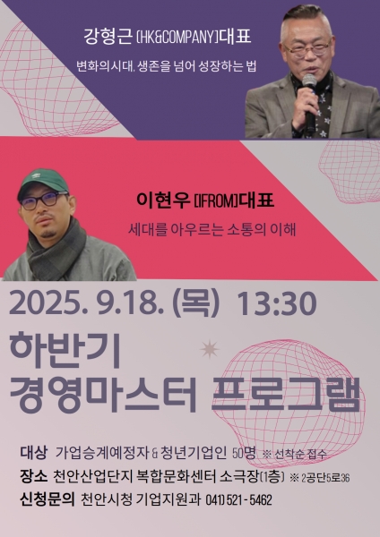 [충청뉴스큐] 천안시는 9월 18일 천안산업단지 복합문화센터에서 열리는 ‘하반기 경영마스터 프로그램’ 참여자를 모집한다고 18일 밝혔다.