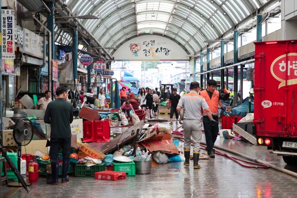 특히 피해가 가장 컸던 전통시장에는 지난 17일부터 공무원, 경찰, 소방서 자율방재단 등 1300명이 현장에 투입돼 폐기물을 처리하고 있으며 양수기와 펌프차량을 동원한 응급 복구를 통해 복구율은 약 65%로 집계됐다.