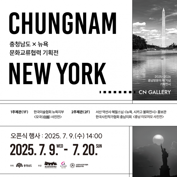 ‘2025-2026년 충남 방문의 해’를 기념해 마련된 충청남도x뉴욕 문화교류 협력 기획전시는 2025년 7월 9일부터 7월 20일까지, 오전 10시부터 오후 6시까지 CN갤러리에서 누구나 무료로 관람할 수 있다.