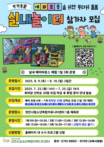 ‘안전한 여름나기 실내놀이터’ 프로그램과 관련한 자세한 사항은 천안시청소년복합커뮤니티센터 누리집을 참고하거나, 천안시청소년복합커뮤니티센터 교육사업팀으로 문의하면 된다.