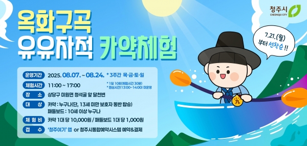 [충청뉴스큐] 청주시는 8월 7일부터 24일까지 상당구 미원면 청석굴 앞 달천변에서 카약과 패들보드를 탈 수 있는 ‘옥화구곡 유유자적’ 체험 프로그램을 진행한다고 21일 밝혔다.