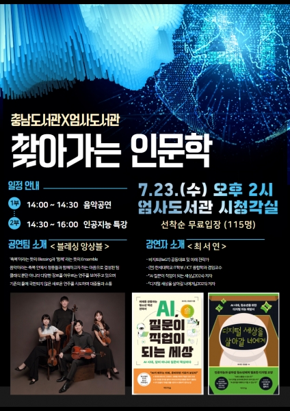 이번 행사는 충남도서관과 엄사도서관이 협업해 마련한 것으로 AI 시대를 살아가는 시민들에게 인문학적 통찰과 문화적 휴식을 동시에 제공할 예정이다.