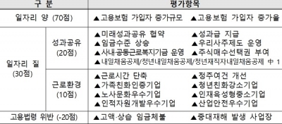 평가항목은 크게 일자리 양, 일자리 질, 법령준수로 구분된다.