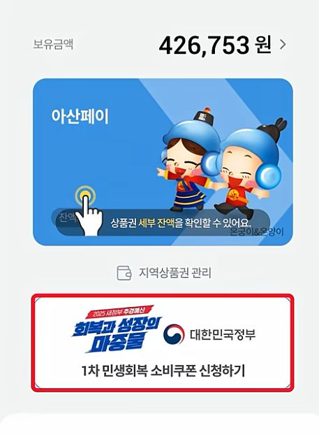 아산시는 민생회복 소비쿠폰 지급을 시작하기 전, 한국조폐공사와 협조해 아산페이 앱에서 소비쿠폰을 쉽고 빠르게 신청할 수 있게 앱 서비스를 개선한 바 있다.