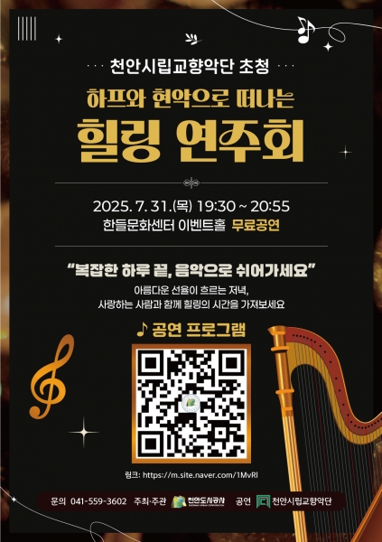 [충청뉴스큐] 천안도시공사는 오는 7월 31일 한들문화센터에서 ‘시민과 함께하는 힐링 연주회’를 개최한다고 24일 밝혔다.
