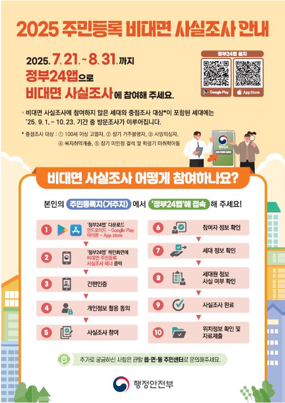 이번 조사는 주민등록 정보를 정비해 복지, 재난, 선거 등 각종 행정서비스에 활용되는 기초자료의 신뢰성을 높이기 위한 것으로 비대면 디지털 조사와 방문조사가 병행 추진된다.