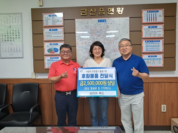 [충청뉴스큐] 삼이야 푸드는 지난 23일 금산읍행정복지센터를 방문해 취약계층을 위해 250만원 상당 홍삼·쌀 음료 등 170세트를 기부했다이날 기부된 물품은 독거노인 등 어려운 이웃에 전달될 예정이다.