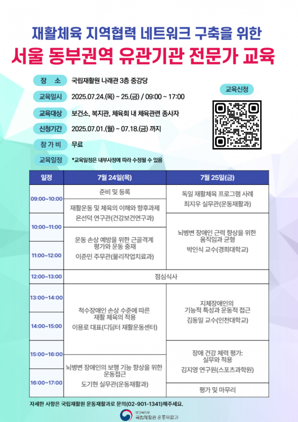 교육은 국립재활원 나래관 3층 중강당에서 진행되며 △재활운동 및 체육의 이론과 과제 △손상 예방을 위한 평가 및 운동 중재 △장애유형별 재활체육의 적용 △해외 재활체육 사례 소개 등 현장 중심의 맞춤형 교육과 실제 사례를 바탕으로 한 교육 프로그램이 운영된다.