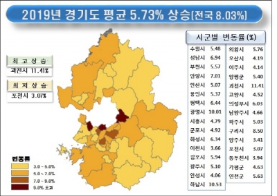 [충청뉴스큐] 2019년 경기도 개별공시지가가 전년 대비 5.73% 상승했다. 같은 기간 전국은 8.03%, 수도권은 8.77% 오른 것으로 나타났다.