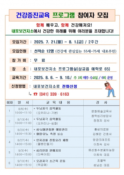 [충청뉴스큐] 예산군 내포보건지소는 2025년 하반기 건강증진교육 프로그램 참여자 12명을 8월 1일까지 선착순 모집한다.