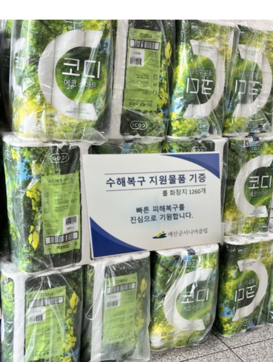 [충청뉴스큐] 예산군시니어클럽은 집중호우로 피해를 입은 이재민을 위해 노인공익활동사업을 통해 마련한 두루마리 화장지 1260개를 전달했다고 28일 밝혔다.