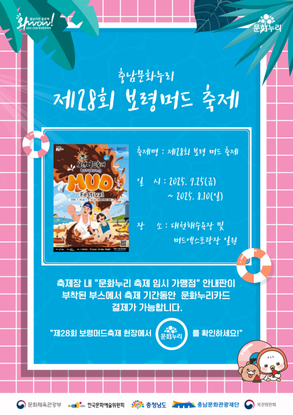 충남문화관광재단 관계자는 “문화누리카드 지역축제 임시 가맹점 운영을 통해 문화누리카드 이용자분들이 머드축제의 주요 체험 프로그램을 직접 경험하실 수 있기를 바란다”며 “앞으로도 문화누리카드의 사용처를 확대해 문화 접근성을 높이기 위한 노력을 지속하겠다”고 밝혔다.