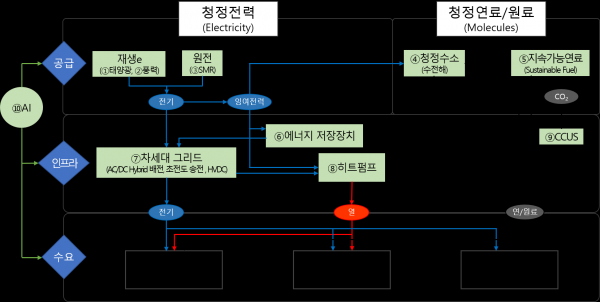 탄소중립 10대 핵심기술·산업 : ➊ 태양광, 해상풍력, SMR, ➋ 청정수소, 지속가능연료, ➌ 에너지저장장치, 차세대 전력망, 에너지AI, 히트펌프, CCUS 특히 에너지 공급 부문의 탄소중립 달성을 위해서는 전기화 확대와 함께 청정연료 도입이 필요하다는 데 인식을 같이하고 ➊청정전력, ➋청정연료 및 ➌청정인프라로 나눠 기술개발, 대규모 실증 및 초기 시장 조성 등을 내용으로하는 새 정부 탄소중립 산업육성 로드맵을 수립할 예정이다.