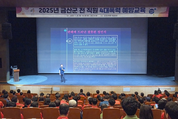 [충청뉴스큐] 금산군은 지난 29일 금산다락원 생명의집 대공연장에서 직장 내 폭력 예방과 성평등한 조직문화 조성을 위해 전 직원 대상 직장 내 성희롱·성폭력·성매매·가정폭력 등 4대 폭력 예방 교육을 전개했다.