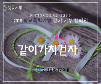 [충청뉴스큐] 인천형 학교폭력예방 ‘같이가치어울림’프로그램의 일환으로 지난 1일 시작한 2019 학교폭력예방 걷기기부 캠페인 ‘같이가치‘꽃길’걷자’가 31일로 대장정을 마무리한다.