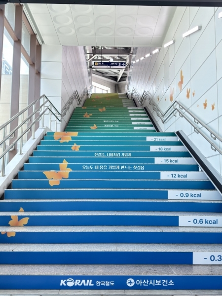 [충청뉴스큐] 아산시가 시민의 일상 속 걷기 실천을 유도하고 건강한 도시환경 조성하기 위해 탕정역에 건강계단과 엘리베이터 옆 걷기 유도 안내판을 설치했다.