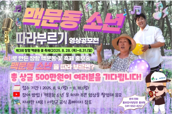 [충청뉴스큐] 서천군이 제3회 장항 맥문동 꽃 축제를 맞아 AI 홍보송 ‘맥문동 소년’ 따라부르기 영상공모전을 개최한다.