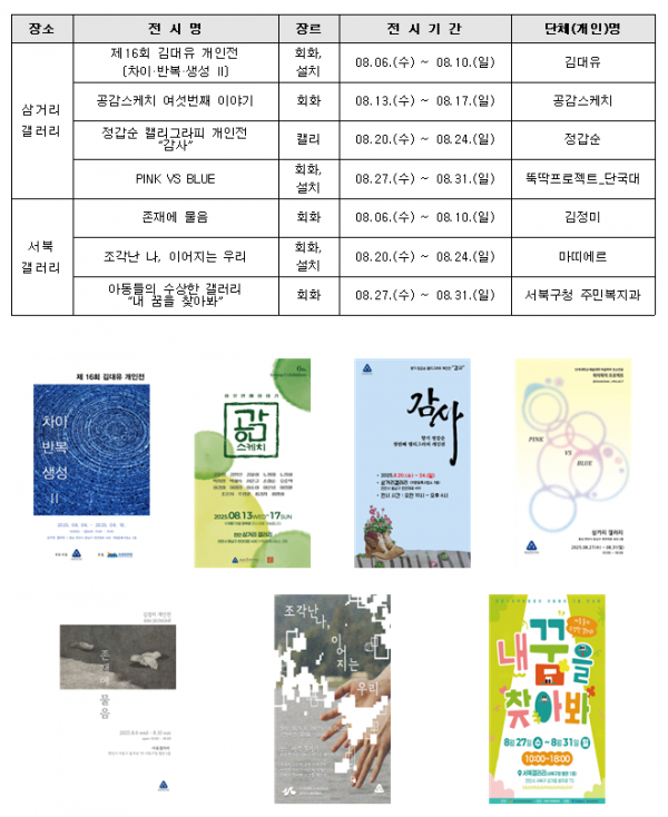 서북 갤러리에서는 △6~ 10일 존재에 물음 △20~ 24일 조각난 나, 이어지는 우리 △27~ 31일 아동들의 수상한 갤러리 ‘내 꿈을 찾아봐’ 총 3건의 전시가 진행된다.
