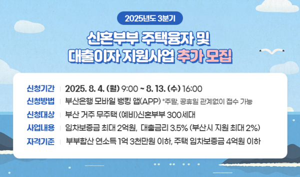 [충청뉴스큐] 부산시는 올해 3분기 ‘신혼부부 주택융자 및 대출이자 지원사업’의 지원 대상자를 오늘부터 8월 13일까지 추가로 모집한다고 밝혔다.