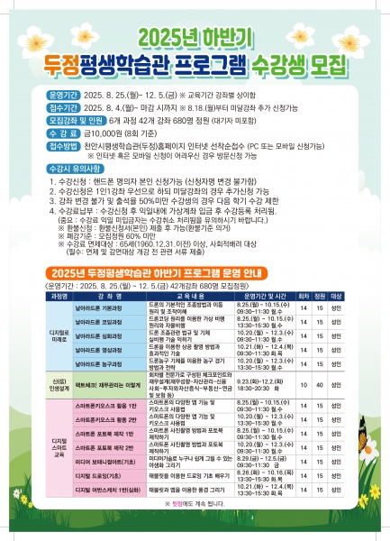 [충청뉴스큐] 천안시는 천안시두정평생학습관 2025년 하반기 프로그램 수강생을 모집한다고 4일 밝혔다.