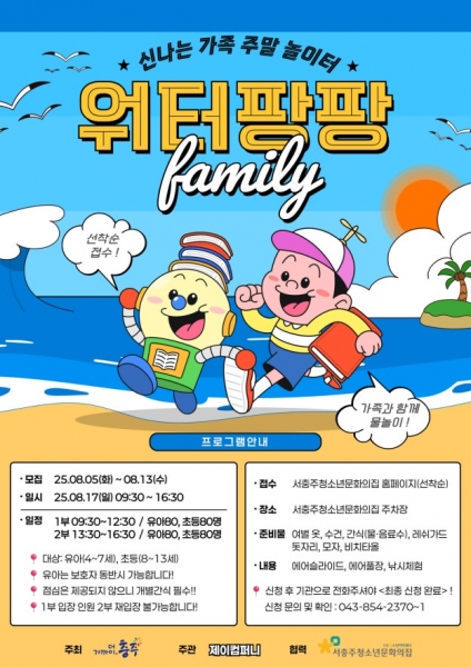 8월 5일부터 13일까지 사전 신청을 받으며 서충주청소년문화의집 누리집을 통해 접수할 수 있다.