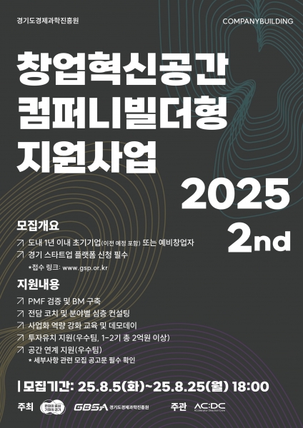 [충청뉴스큐] 경기도와 경기도경제과학진흥원은 ‘2025 경기창업혁신공간 컴퍼니빌더형 지원사업’ 2기 참가기업을 모집한다.