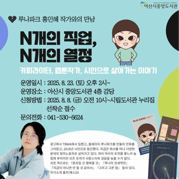 [충청뉴스큐] 아산시립도서관이 23일 오후 2시, 중앙도서관에서 청년 대상 인문학 특강 ‘루나파크 홍인혜 작가와의 만남-N개의 직업, N개의 열정’을 운영한다.