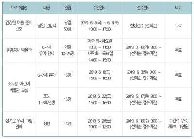 한편 정관박물관은 11월까지 매월 2·4째 토요일 오후 3시에 유아 및 초등 저학년을 대상으로 한 토요상설 교육프로그램 ‘소두방 어린이 박물관 교실’을 운영한다. 6월 28일 ‘부산 문화가 있는 날’에는 10시부터 성인을 대상으로 하는 전통문화 체험인 ‘정겨운 우리 그림, 민화’ 수업을 진행하는 등 다양한 연령대를 위한 체험 프로그램을 운영하고 있다.