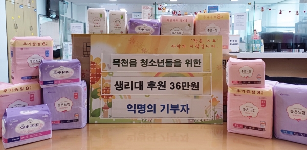 기부자는 언론을 통해 저소득 여성청소년의 여성용품 부족 문제를 접한 뒤 조금이나마 도움이 되고자 36만원 상당의 여성용품을 기탁했다.