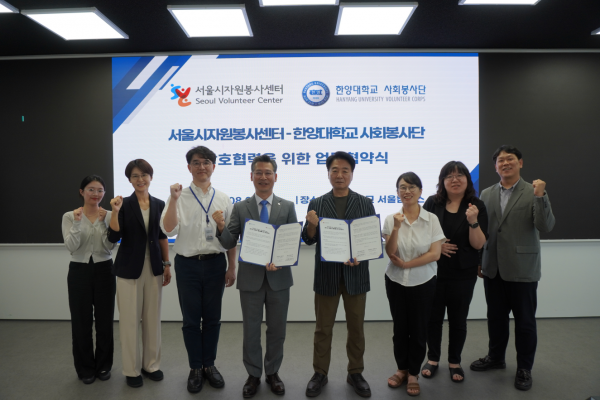[충청뉴스큐] 서울시자원봉사센터는 한양대학교 사회봉사단과 지난 8월 7일 한양대학교 신본관에서 대학 내 자원봉사 활성화를 위한 업무협약을 체결했다고 밝혔다.