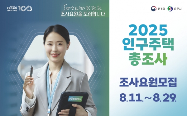[충청뉴스큐] 충주시는 ‘2025년 인구주택총조사’의 성공적 추진을 위해 8월 11일부터 29일까지 조사요원 151명을 모집한다고 밝혔다.