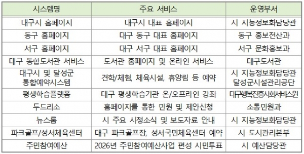 중단되는 주요 서비스는 대구시와 동·서구 홈페이지, 대구 통합도서관 서비스 등 총 10개 서비스다.