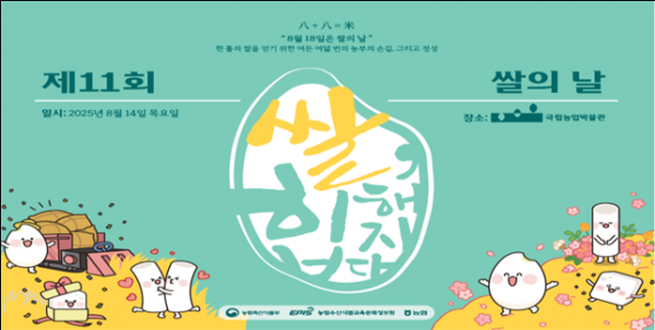 [충청뉴스큐] 농림축산식품부는 오는 8월 18일 제11회 쌀의 날을 맞아 쌀의 우수성을 알리고 쌀 중심의 식습관 확산과 쌀 소비 활성화를 위해 8월 14일에 수원 국립농업박물관에서 기념행사를 진행한다.