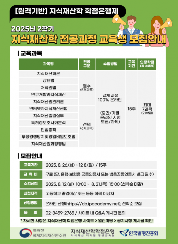[충청뉴스큐] 특허청 국제지식재산연수원과 한국발명진흥회는 8. 12.~21.까지 ‘지식재산학’을 전공으로 하는 학점은행 ’ 25년 2학기 온라인 수강생을 모집한다.